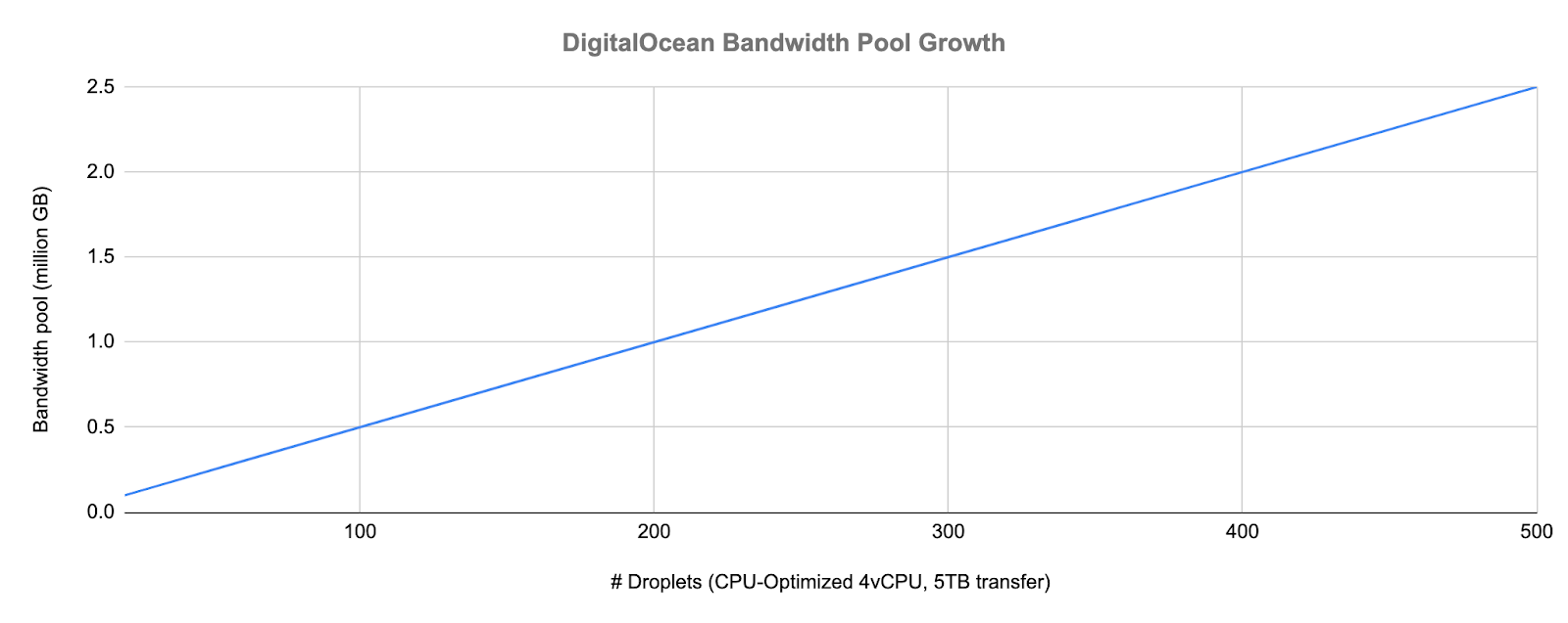 In our rough and deliberately simple estimation, you might need something like 500 CPU-Optimized Droplets, each with 4 vCPUs, 8GB RAM, and 5000GB transfer. By the time you reach 50 million users and 500 Droplets, you’ve accrued a total of 2.5 million GB in your account’s bandwidth pool. As you scale up, here’s how your bandwidth pool grows with your Droplet count.