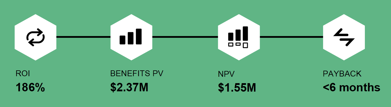 • ROI of 186%. The decision-maker interviews and financial analysis found that a composite organization experiences benefits of $2.37 million over three years versus costs of $829,000, adding up to a net present value (NPV) of $1.55 million and an ROI of 186%.